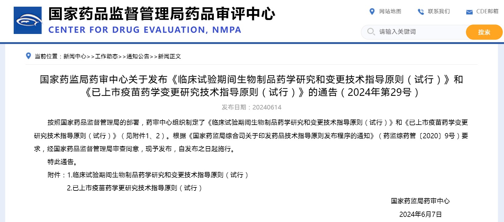 國(guó)家藥監(jiān)局藥審中心關(guān)于發(fā)布《臨床試驗(yàn)期間生物制品藥學(xué)研究和變更技術(shù)指導(dǎo)原則(試行)》和《已上市疫苗藥學(xué)變更研究技術(shù)指導(dǎo)原則(試行)》的通告(2024年第29號(hào))