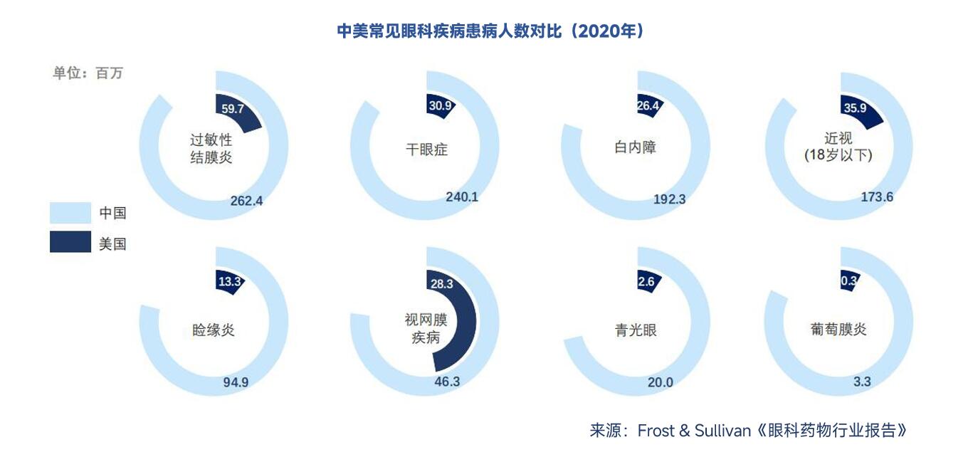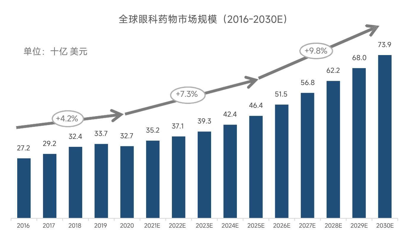 目前,全球眼科市場整體呈現(xiàn)出穩(wěn)定增長、集中度較高的特點(diǎn)。2016年至2020 年,全球眼科藥物市場規(guī)模從277億美元增長至327億美元,復(fù)合年增長率為 4.2%。隨著未來更多眼科創(chuàng)新藥物的研發(fā)和上市,預(yù)計2025年將達(dá)到464億美元,2030年將達(dá)到739億美元。2016-2020年中國眼科藥物市場規(guī)模從151億增長至188億元,復(fù)合年增長率達(dá)5.7%,預(yù)計2025年將達(dá)到440億元,2030年將達(dá)到1084億元。預(yù)計未來,中國將以超過全球2倍的平均增長率快速增長,發(fā)展勢頭強(qiáng)勁。