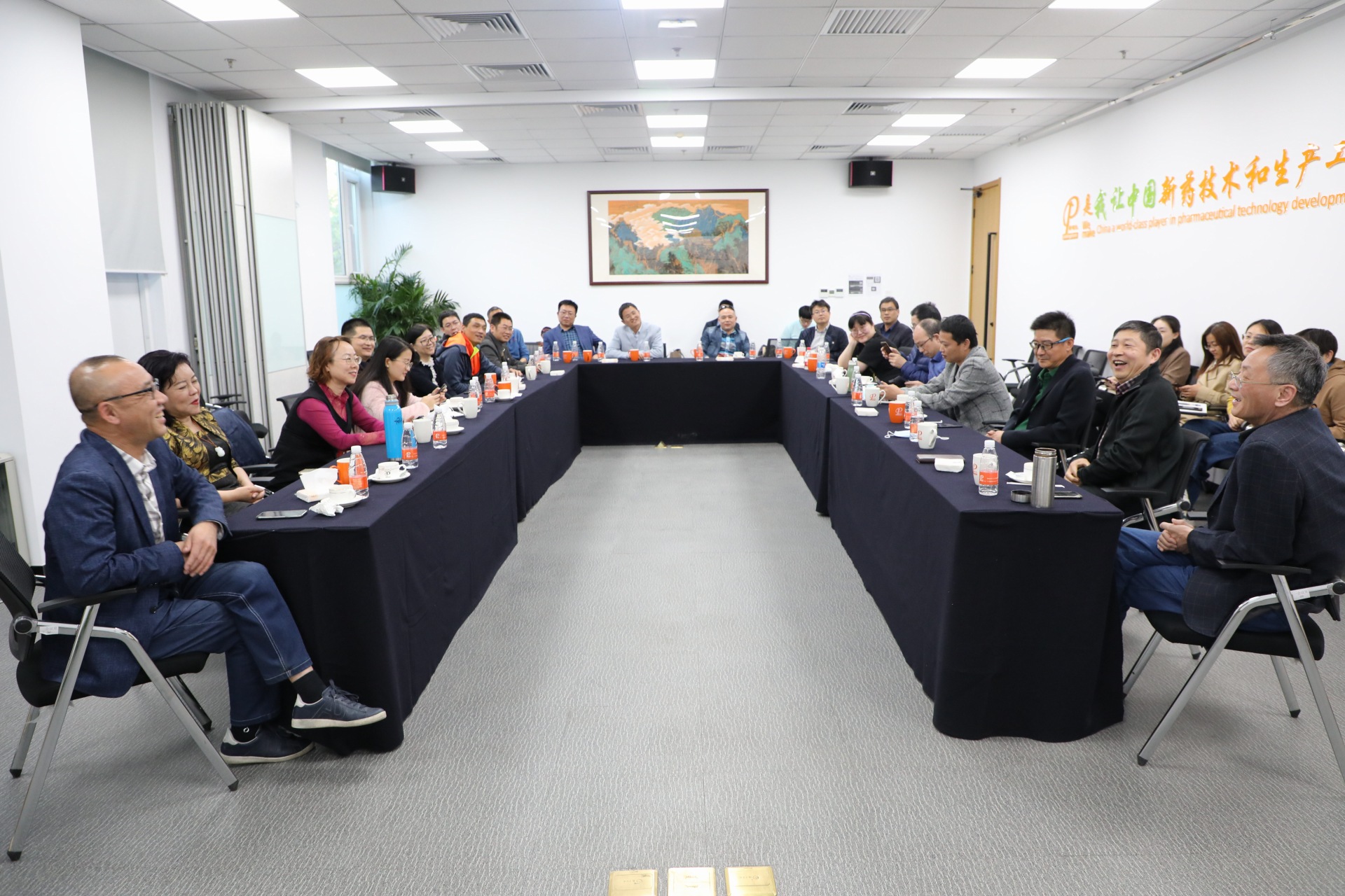 On April 17, a delegation from Pharnex, composed of Mr. Wang Bo, founder of Pharnex; Ms. Yan Jie, Chairman of Hankang Medicine, Ms. Lu Donghong, Technical Deputy Director of the All-China Federation of Industry and Commerce and representatives of nearly 20 leading pharmaceutical companies in the fields of pharmaceutical investment, innovative drug research and development, import and export trade, came to Leadingpharm for visit and communication. Mr. Tao Xinhua, chairman of Leadingpharm, Mr. Liu Kun, executive vice president, received and made in-depth exchanges with all parties.