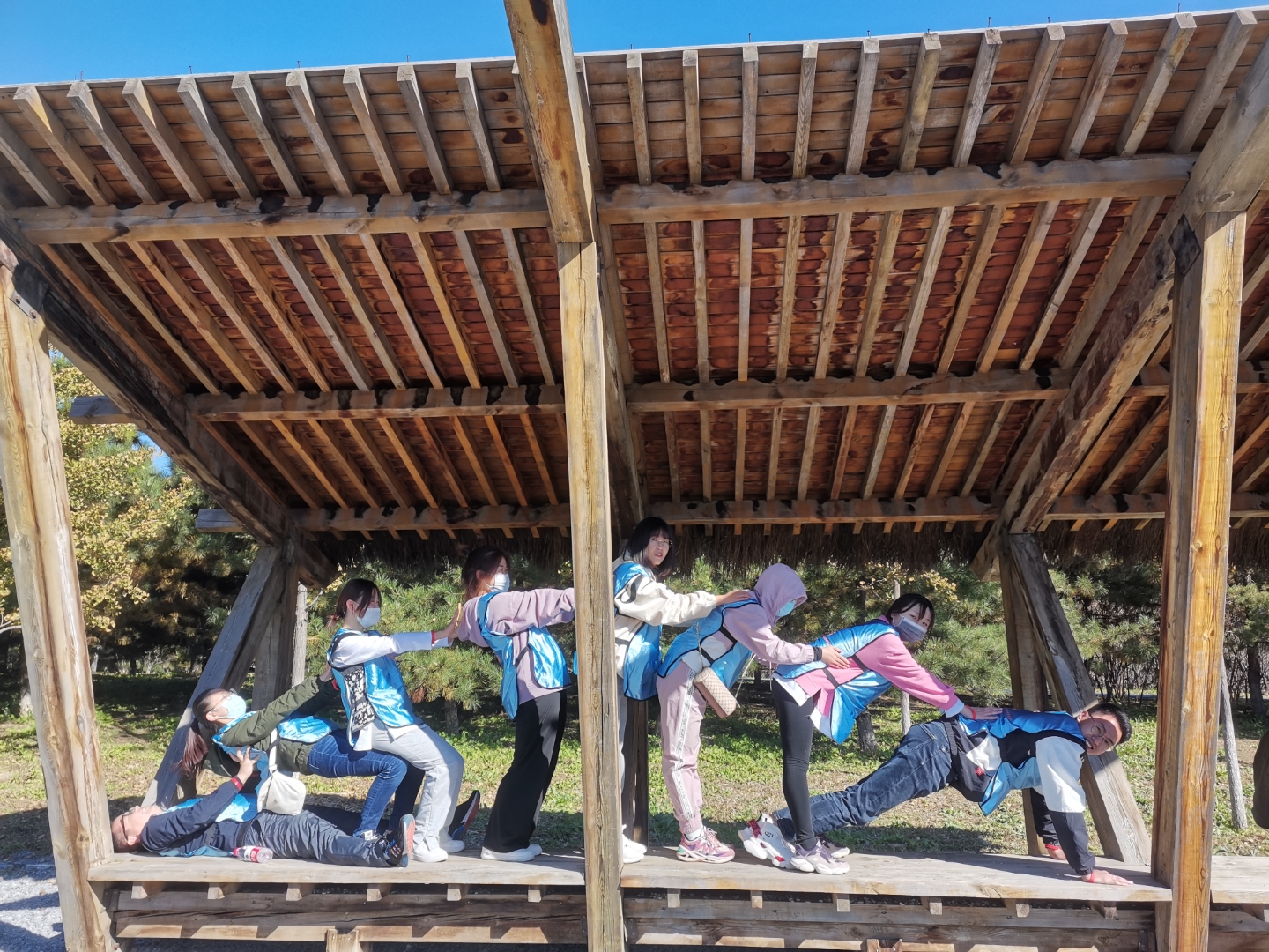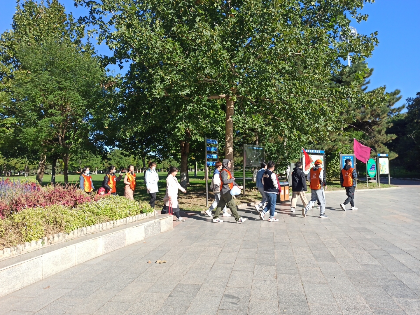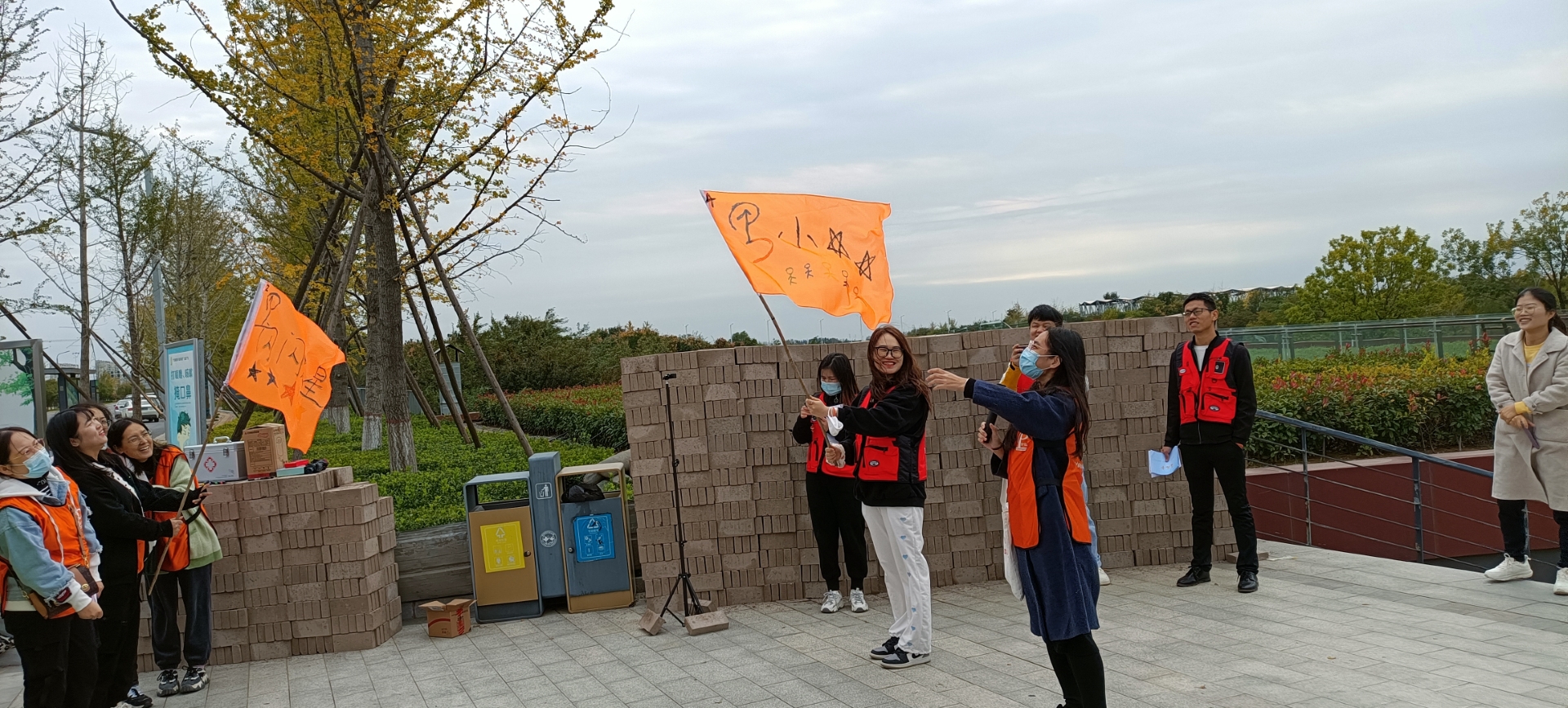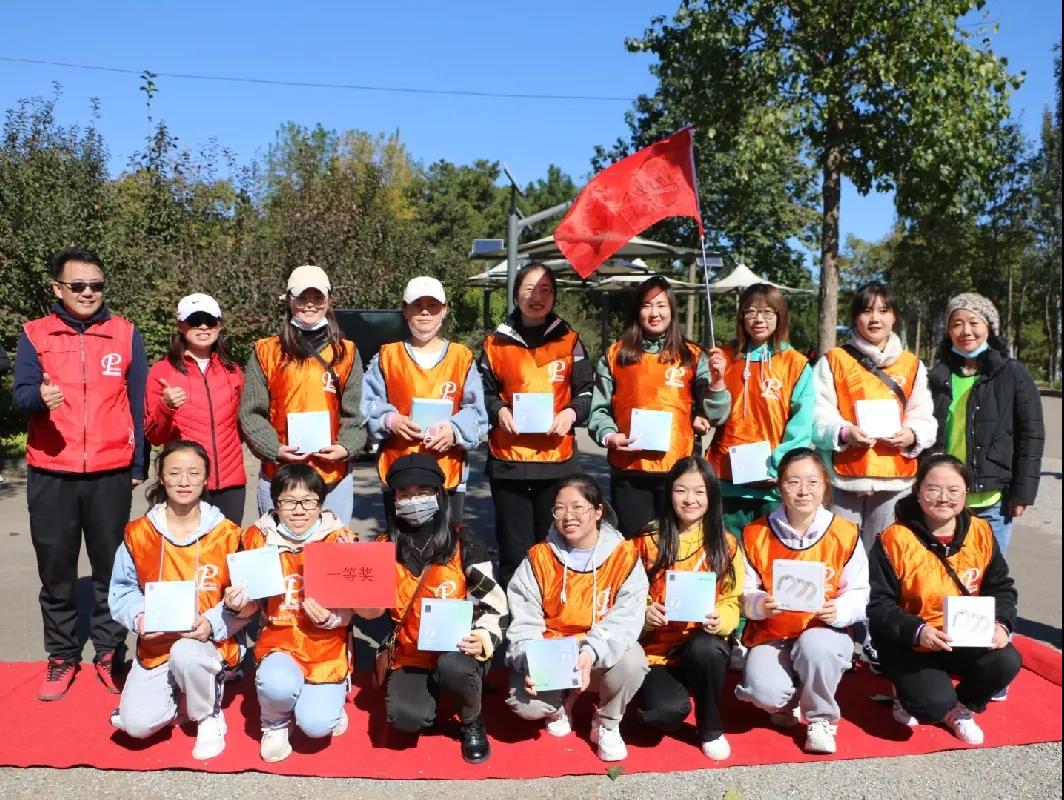 ▲ All team members hold high the team flag, listen to the autumn wind, step on fallen leaves, talk and laugh, and accompany their peers.